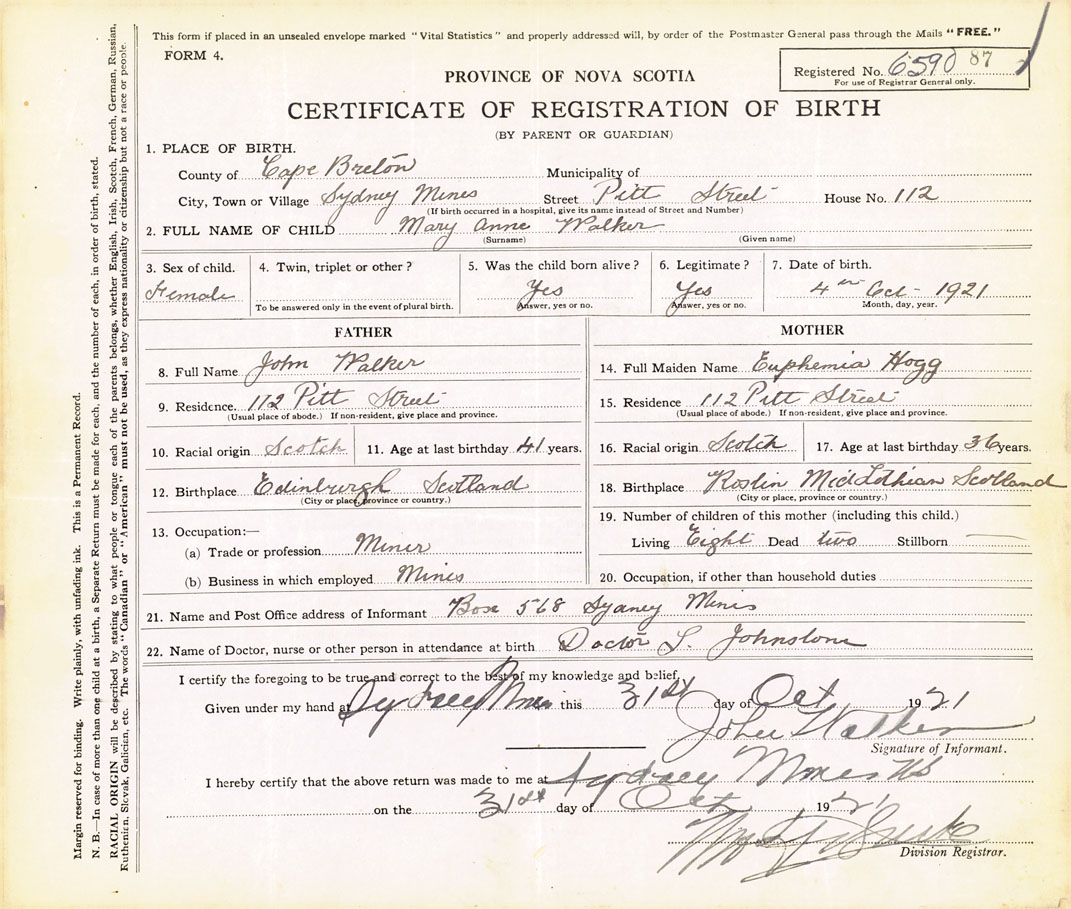21. Name and Post Office address of Informant John Walker Sydney Mines
