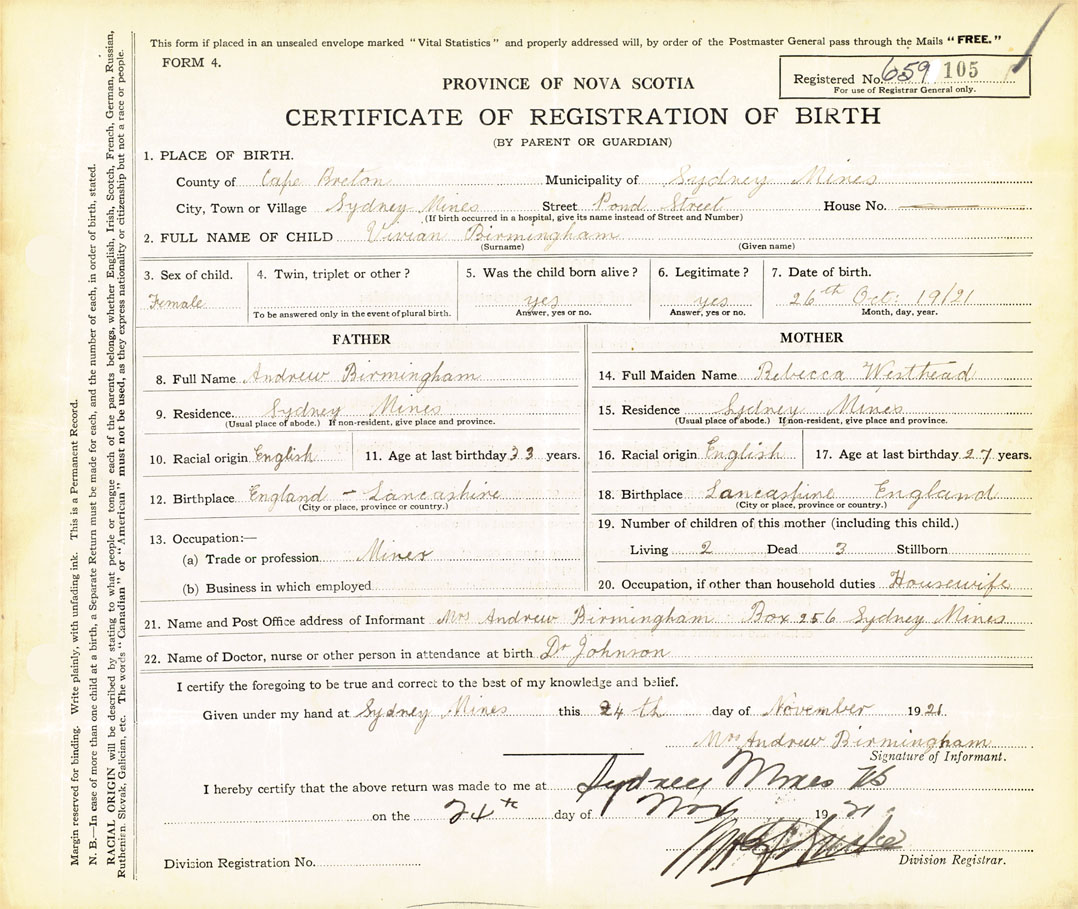 21. Name and Post Office address of Informant Rebecca Birmingham Sydney Mines