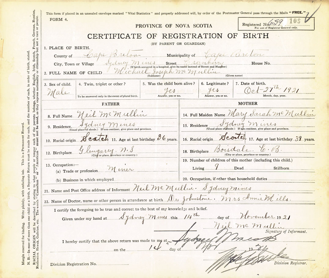 21. Name and Post Office address of Informant Neil McMullin Sydney Mines