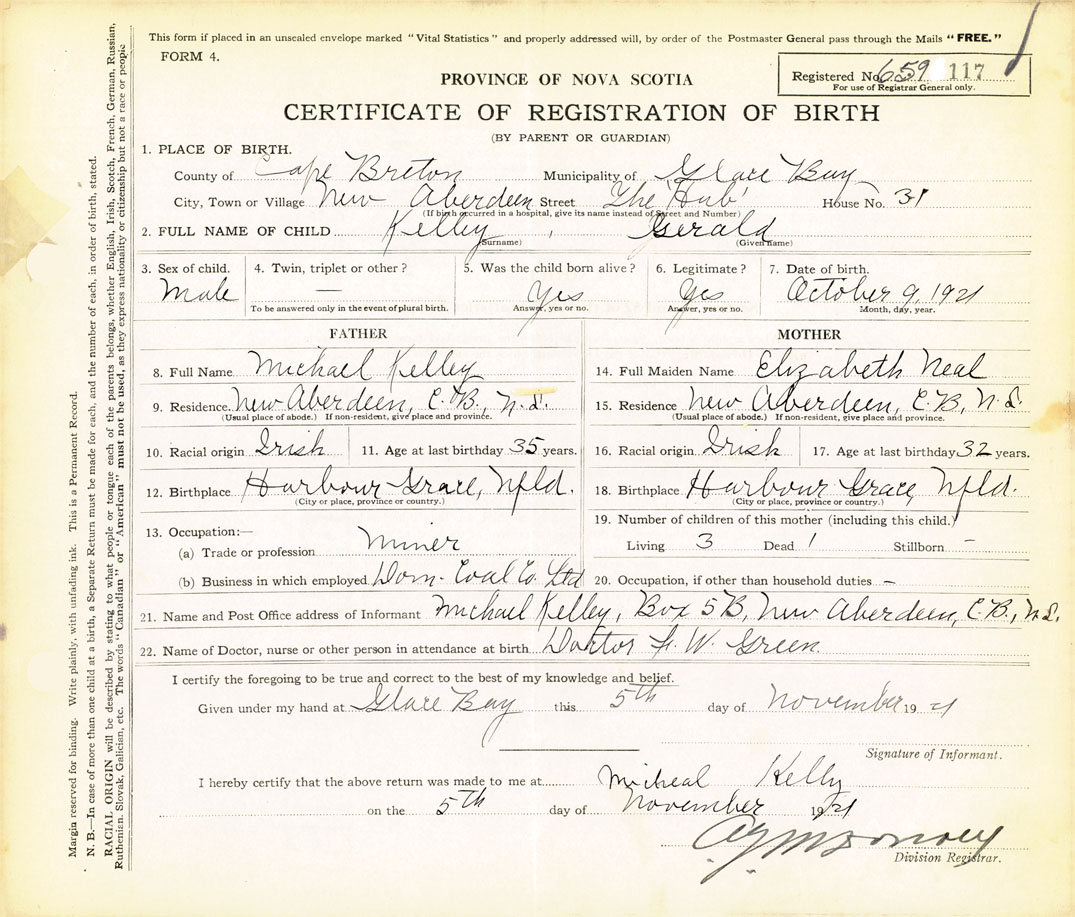 21. Name and Post Office address of Informant Michael Kelley Box 573, New Aberdeen, C.B.