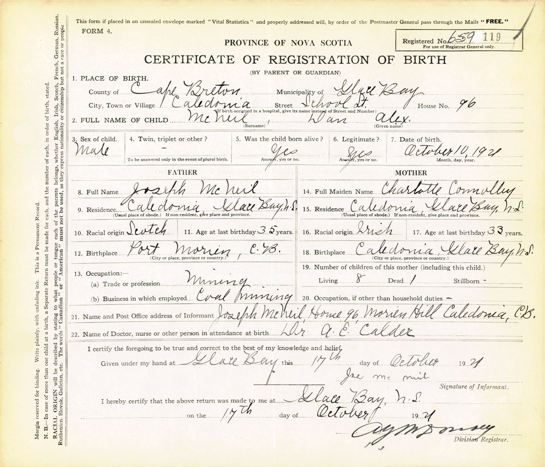 21. Name and Post Office address of Informant Joseph McNeil House 96, Morien Hill, Caledonia, C.B.
