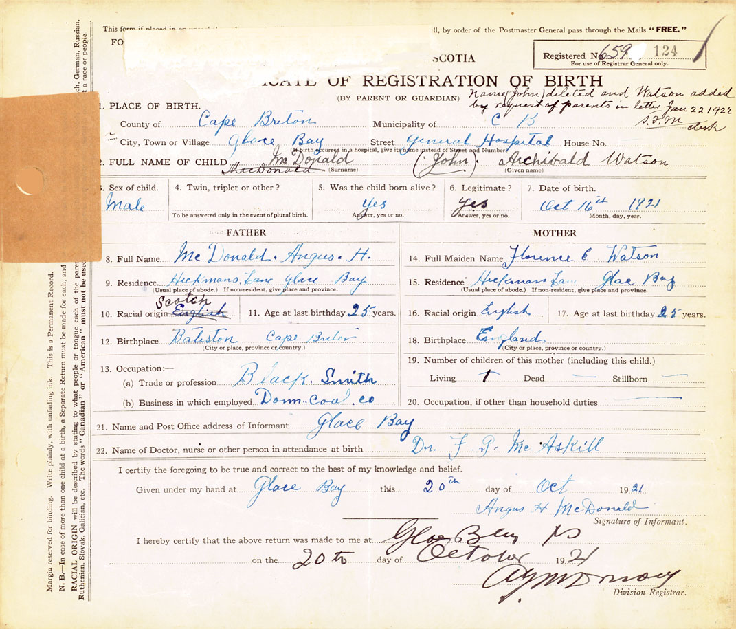 2. FULL NAME OF CHILD MacDonald, Archibald Watson