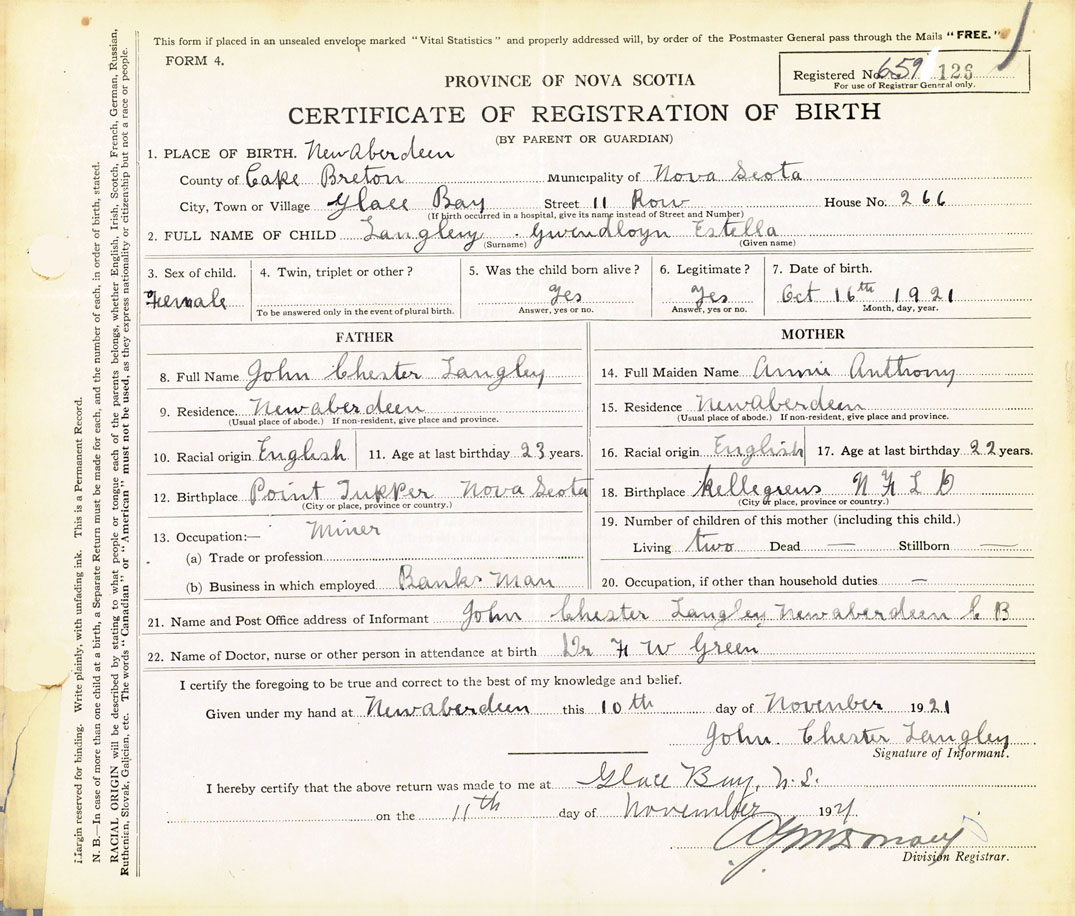 21. Name and Post Office address of Informant John Chester Langley New Aberdeen Cape Breton
