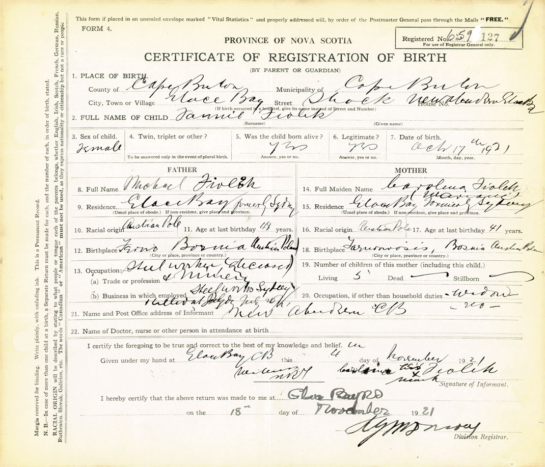 21. Name and Post Office address of Informant Carolina Fiolik New Aberdeen