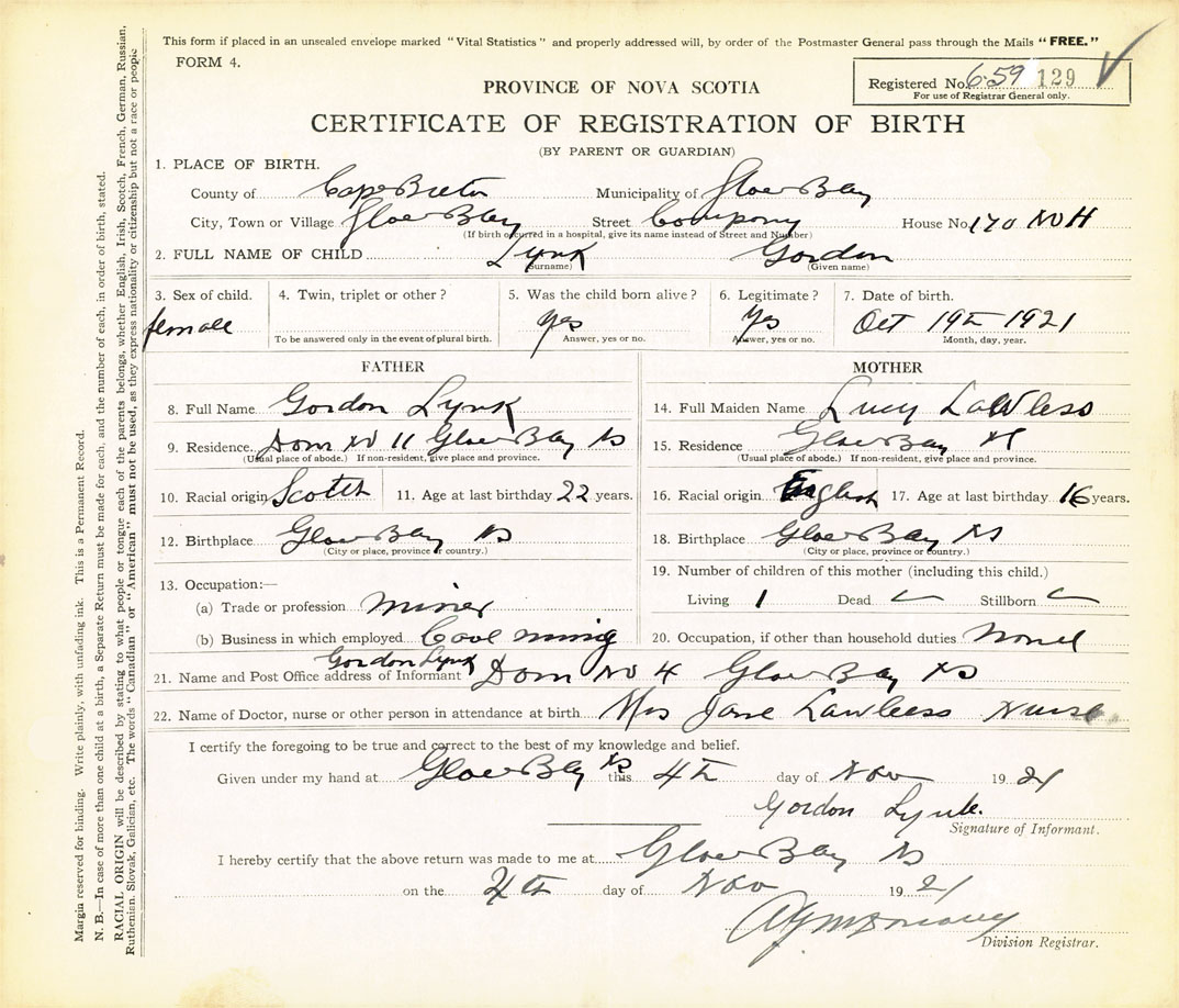 21. Name and Post Office address of Informant Gordon Lynk Glace Bay