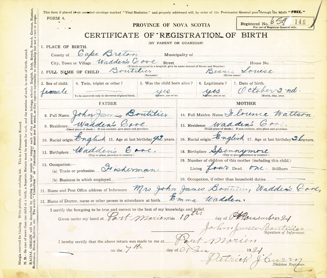21. Name and Post Office address of Informant John James Boutilier Waddens Cove
