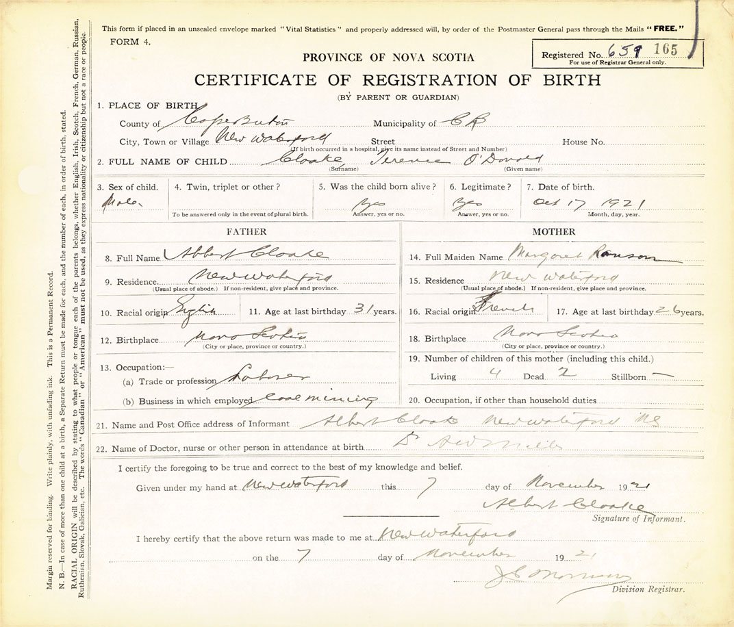 21. Name and Post Office address of Informant Albert Cloake New Waterford