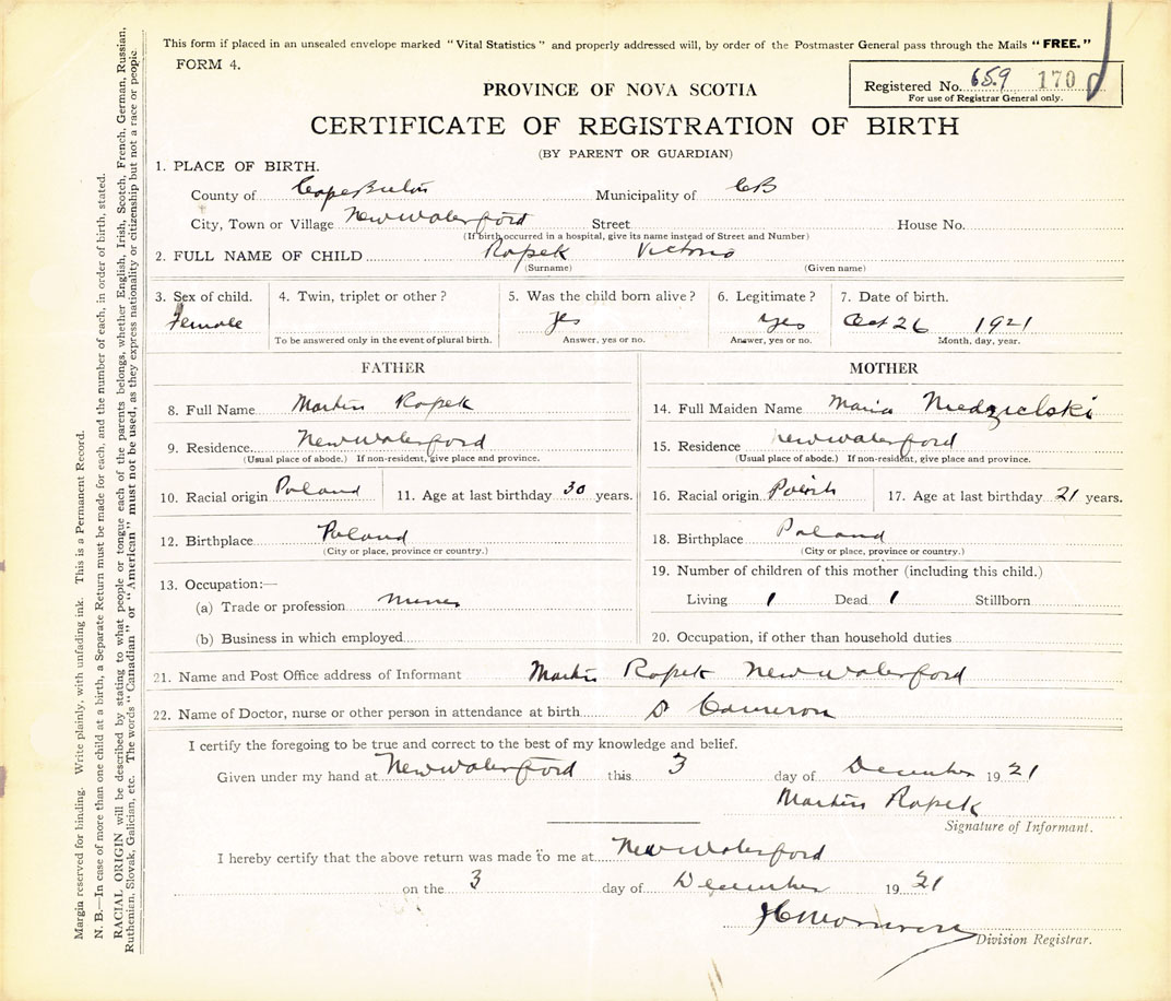 Female Birth Registration: Year: 1921 number: 65900170