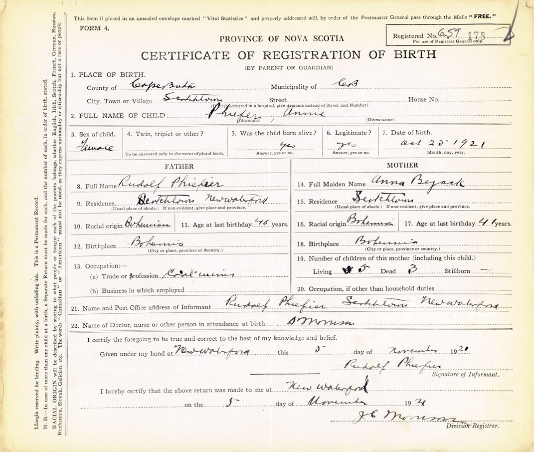 21. Name and Post Office address of Informant Rudolf Phiefier Scotchtown, New Waterford