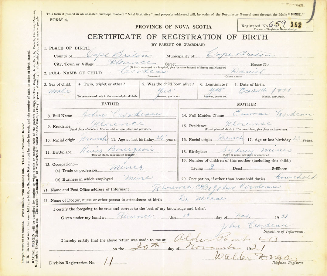 21. Name and Post Office address of Informant John Cordeau Florence, Cape Breton