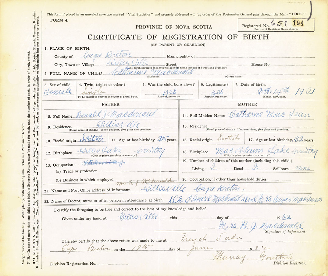 21. Name and Post Office address of Informant Mrs. R. J. McDonald Gillisville, Cape Breton Co., NS