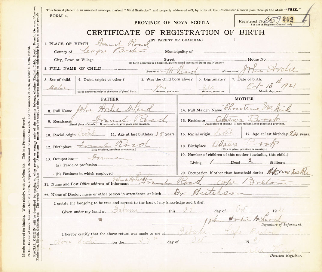 21. Name and Post Office address of Informant John Archie McLeod French Road, Cape Breton