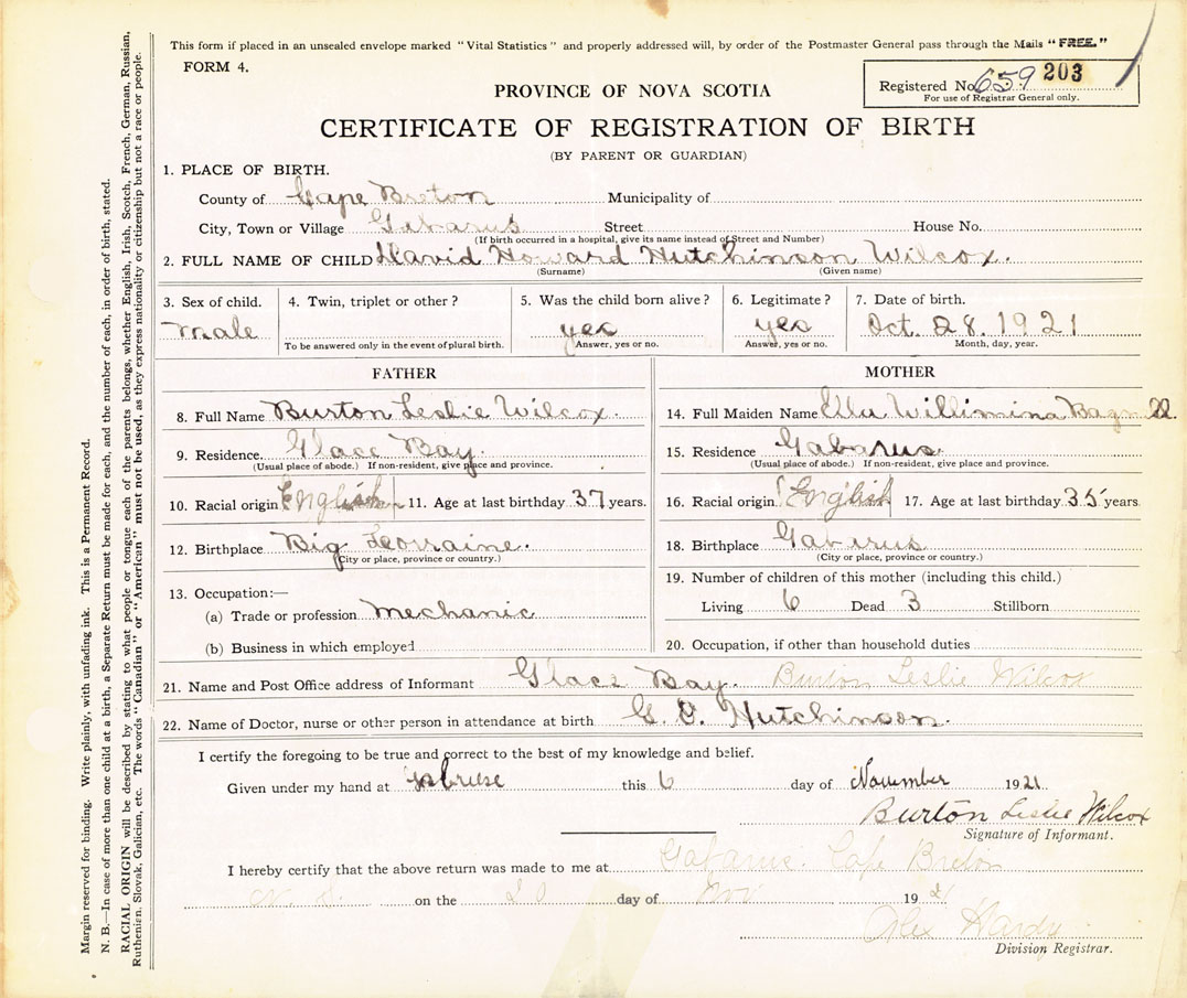 21. Name and Post Office address of Informant Burton Leslie Wilcox Glace Bay