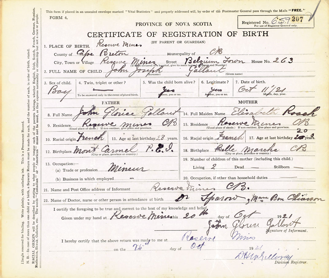 21. Name and Post Office address of Informant John Glorice Gallant Reserve Mines, CB