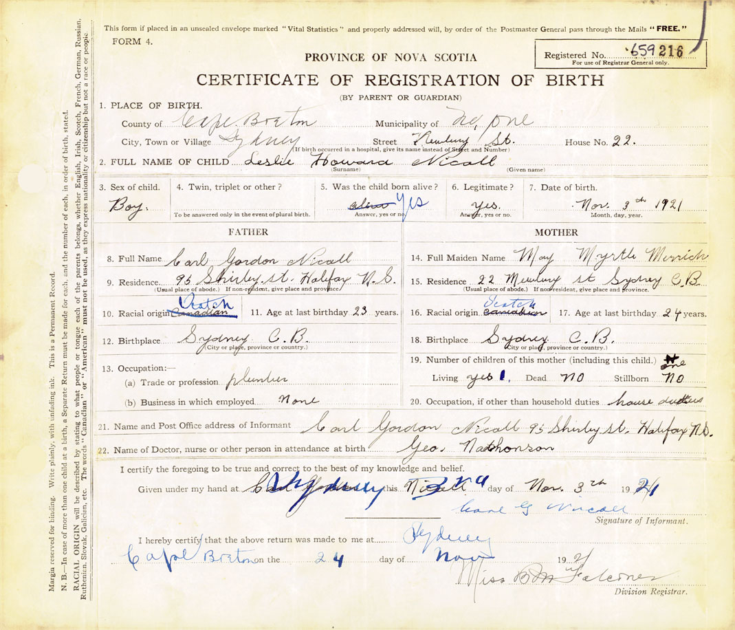 21. Name and Post Office address of Informant Carl Gordon Nicoll 95 Shirley St., Halifax