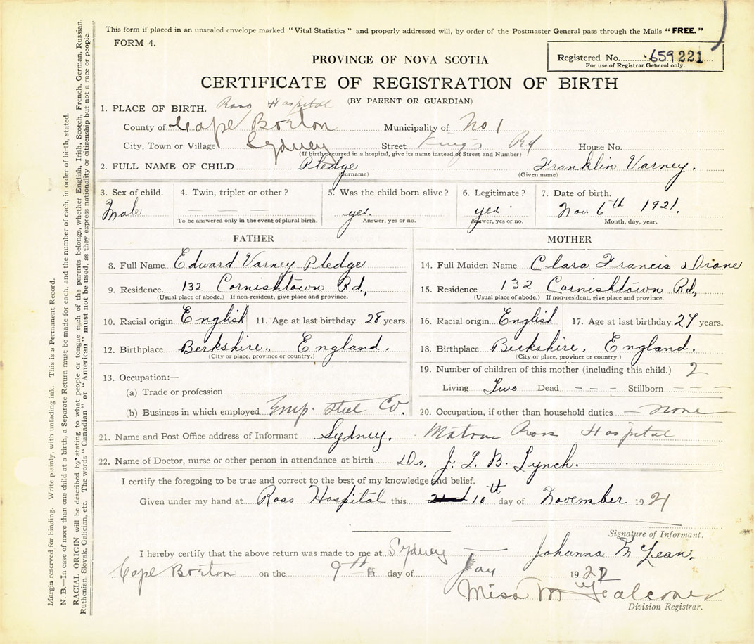 Male Birth Registration: Year: 1921 number: 65900221