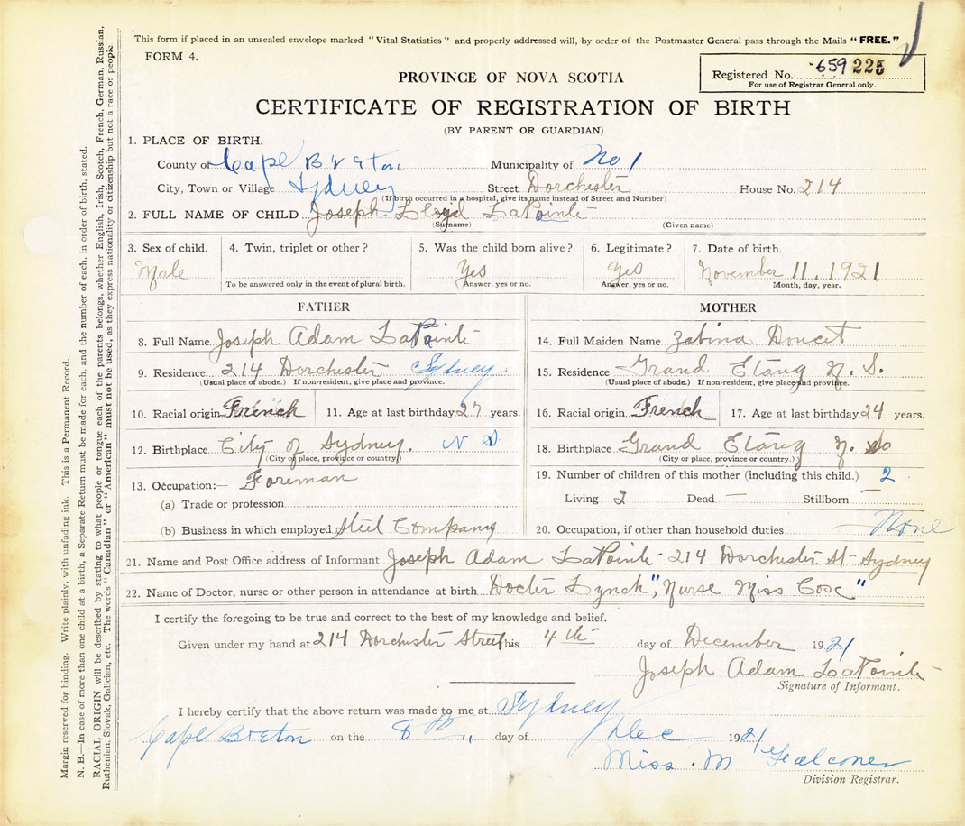 21. Name and Post Office address of Informant Joseph Adam LaPointe 214 Dorchester St, Sydney