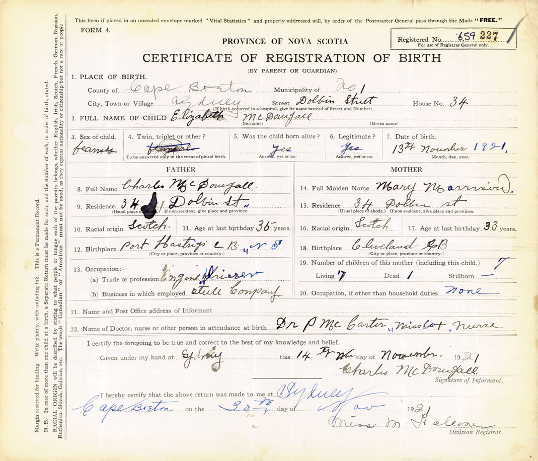 21. Name and Post Office address of Informant Charles McDougall 34 Dolbin St, Sydney, Cape Breton