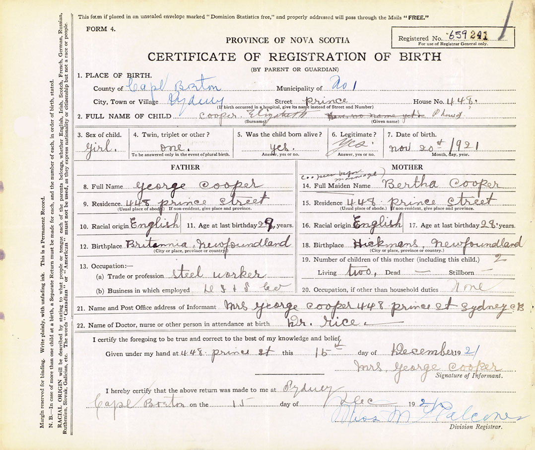 21. Name and Post Office address of Informant Mrs George Cooper 448 Prince St, Sydney, CB