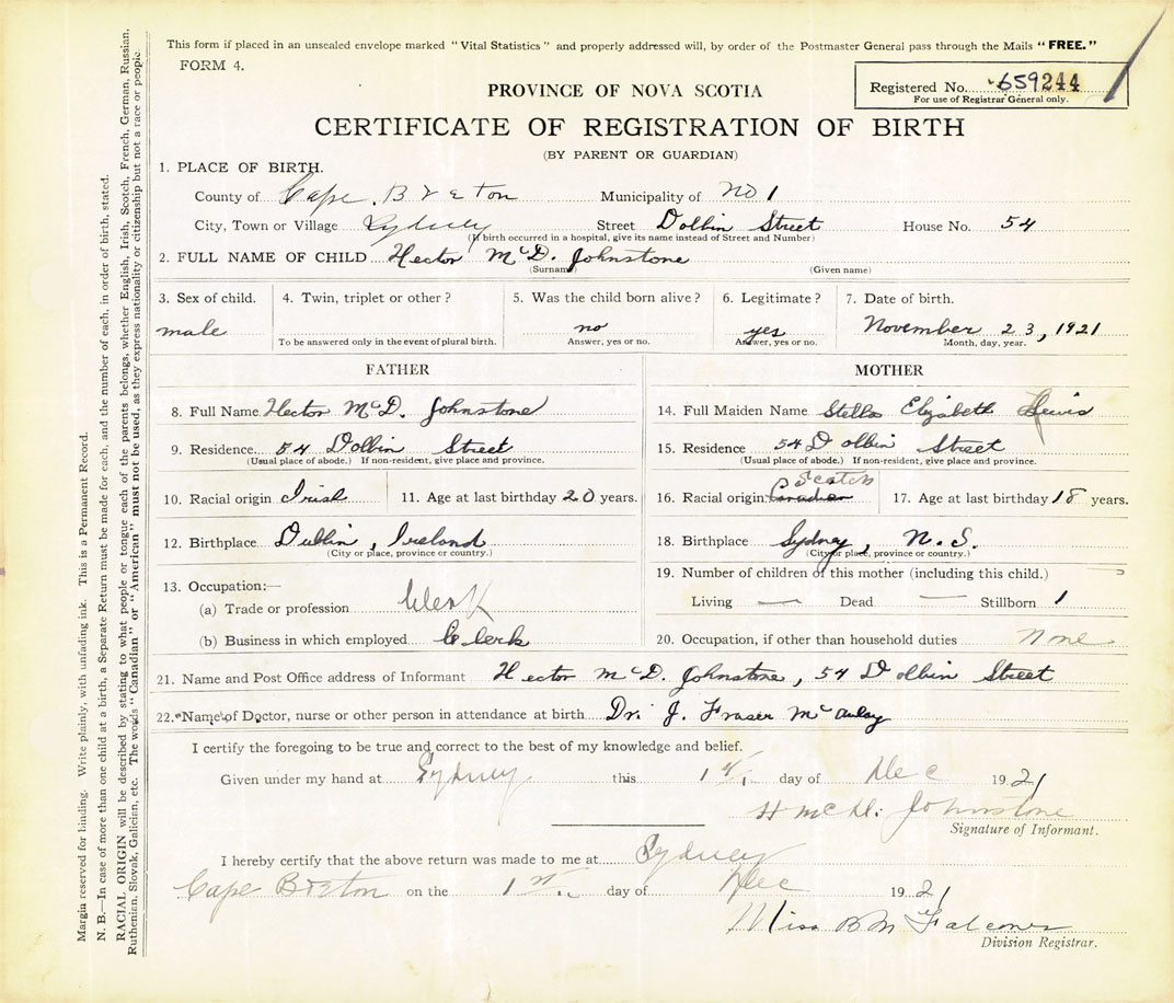 21. Name and Post Office address of Informant Hector McD. Johnstone 54 Dobbin Street, Sydney, Cape Breton