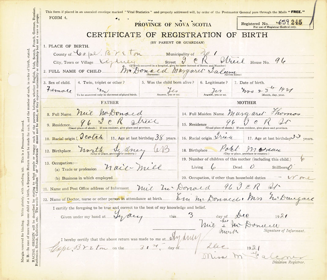 21. Name and Post Office address of Informant Neil McDonald 96 Intercolonial Railway Street, Sydney, CB