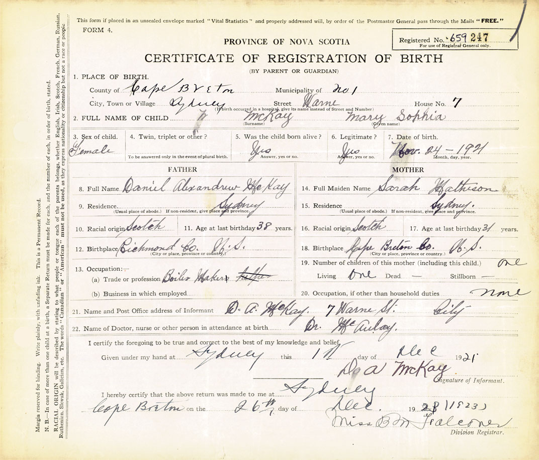 21. Name and Post Office address of Informant D. A. McKay 7 Warne Street, Sydney, Cape Breton