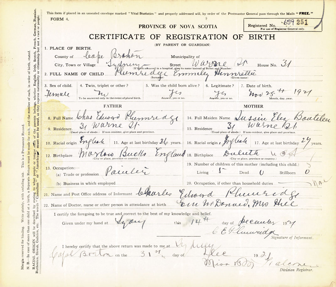 21. Name and Post Office address of Informant Charles Edward Plumridge 31 Warne Street, Sydney, Cape Breton