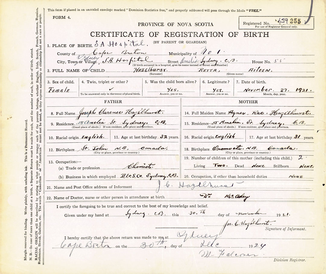 Female Birth Registration: Year: 1921 number: 65900255