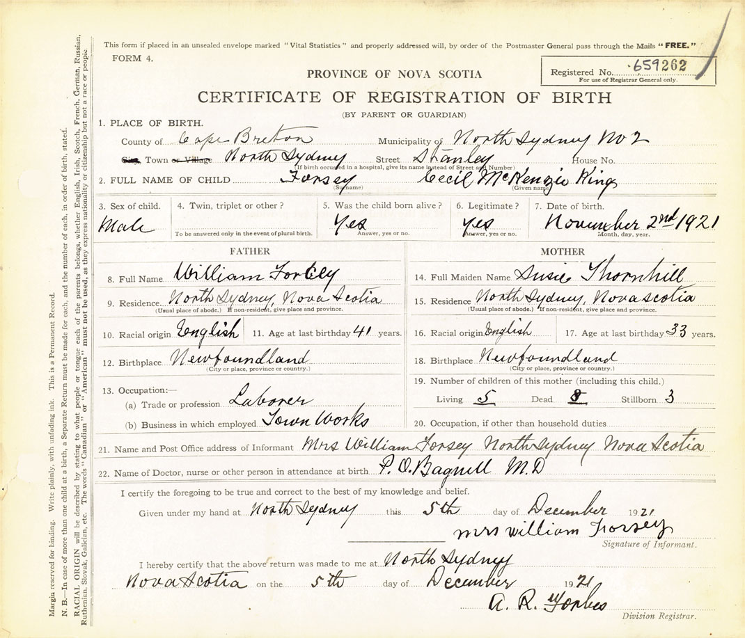 21. Name and Post Office address of Informant Mrs. William Forsey North Sydney