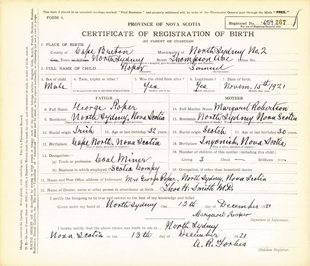 21. Name and Post Office address of Informant Mrs. George Roper North Sydney