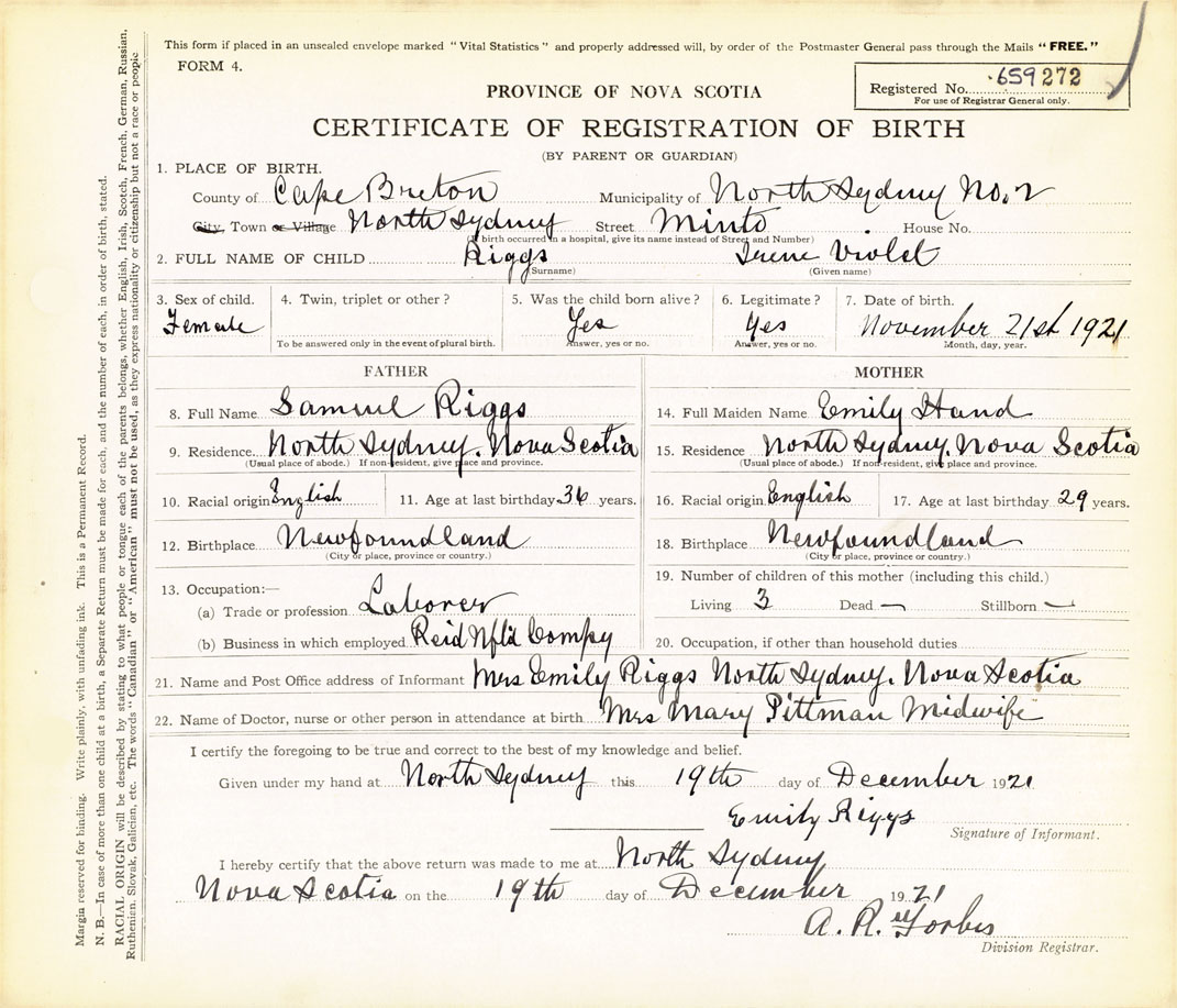 21. Name and Post Office address of Informant Mrs. Emily Riggs North Sydney, Cape Breton