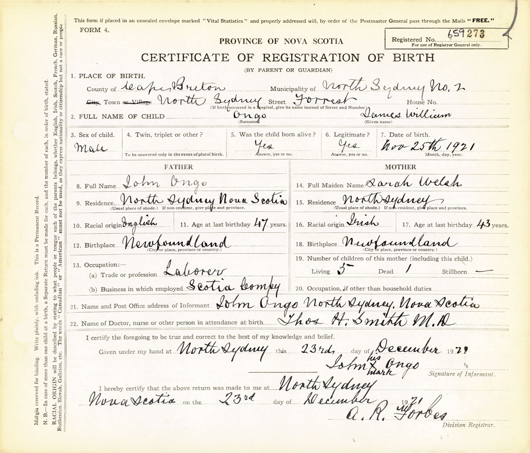 21. Name and Post Office address of Informant John Ongo North Sydney, Cape Breton