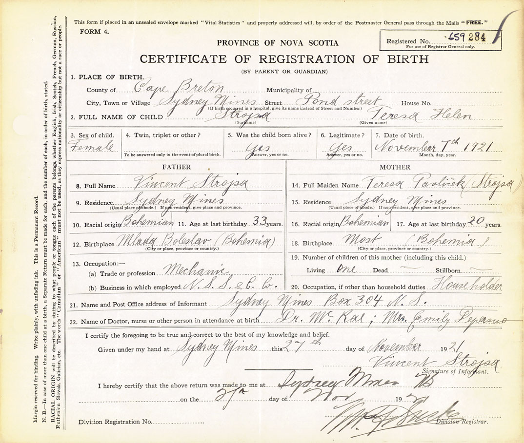21. Name and Post Office address of Informant Vincent Strojsa Sydney Mines
