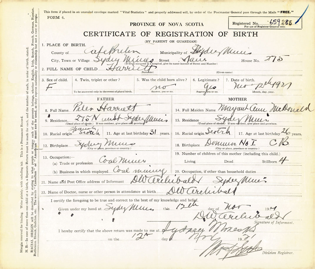 21. Name and Post Office address of Informant Dr. D.W. Archibald Sydney Mines