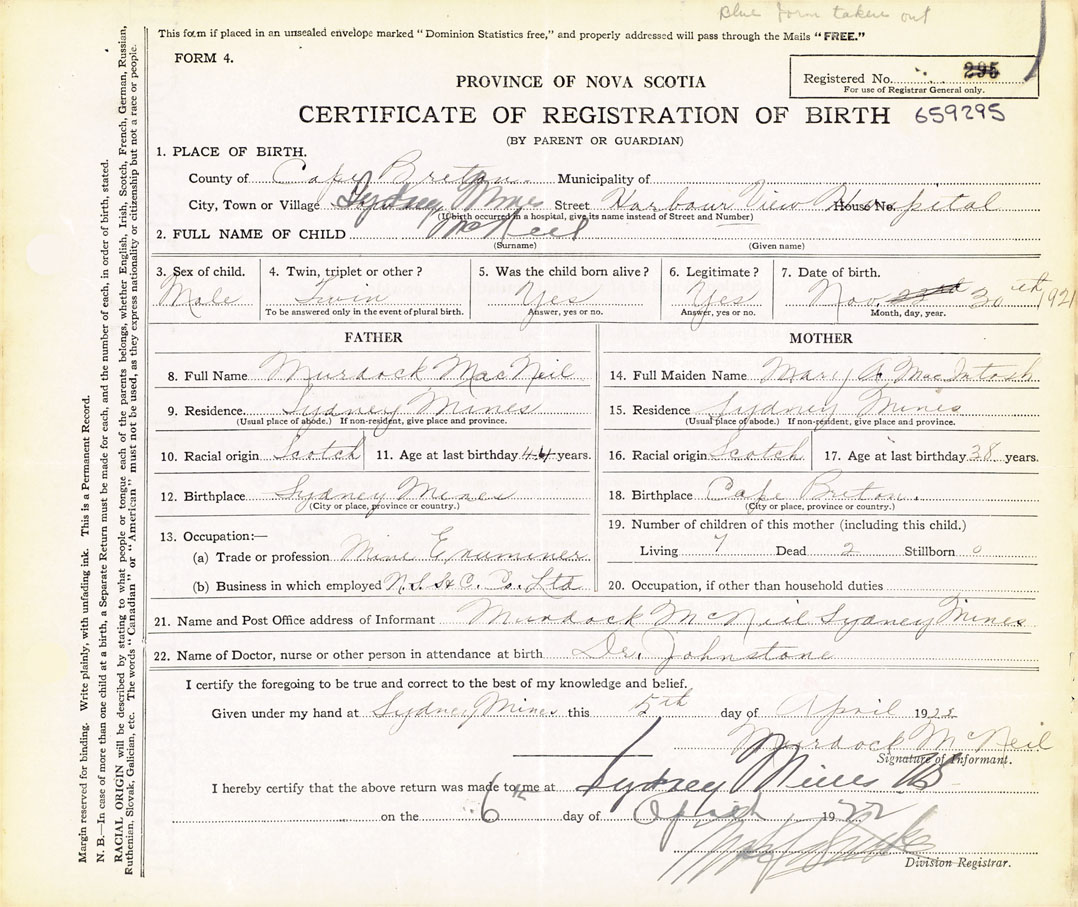21. Name and Post Office address of Informant Murdock McNeil Sydney MInes