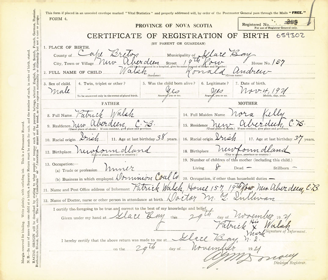 21. Name and Post Office address of Informant Patrick Walsh House 157, 19th Row, New Aberdeen, Cape Breton