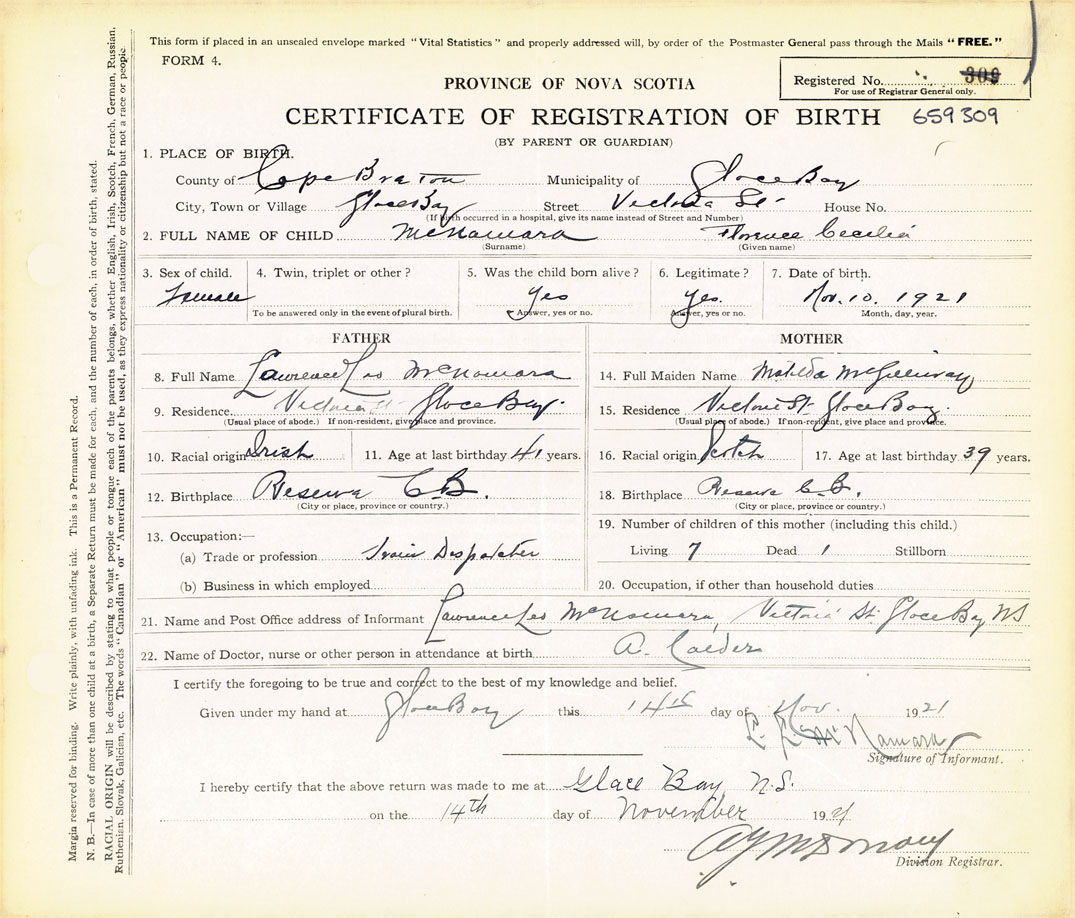 21. Name and Post Office address of Informant Lawrence Leo McNamara Victoria ST, Glace Bay
