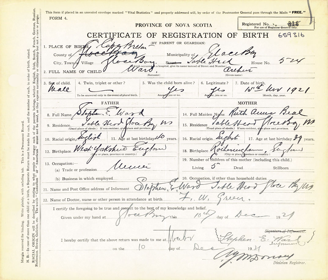 21. Name and Post Office address of Informant Stephen E. Ward Table Head Glace Bay