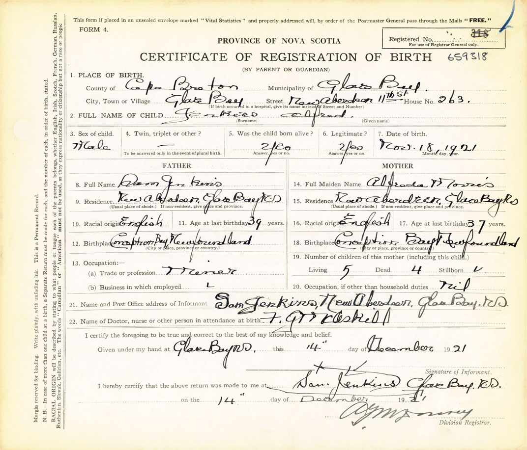 21. Name and Post Office address of Informant Sam Jenkins New Aberdeen, Glace Bay