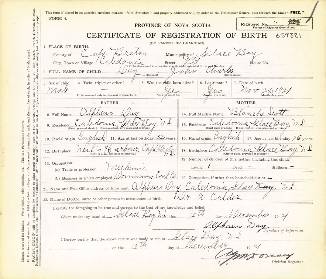 21. Name and Post Office address of Informant Alpheus Day Caledonia, Glace Bay