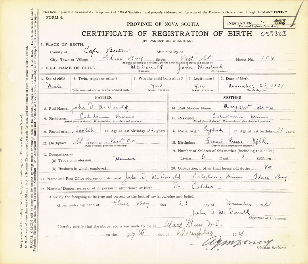 21. Name and Post Office address of Informant John D McDonald Caledonia Mines, Glace Bay