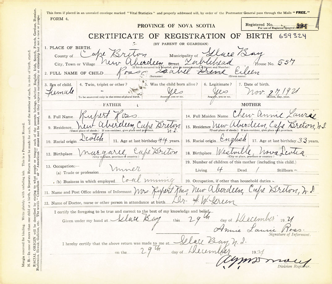 21. Name and Post Office address of Informant Annie Laurie Ross New Aberdeen, Cape Breton