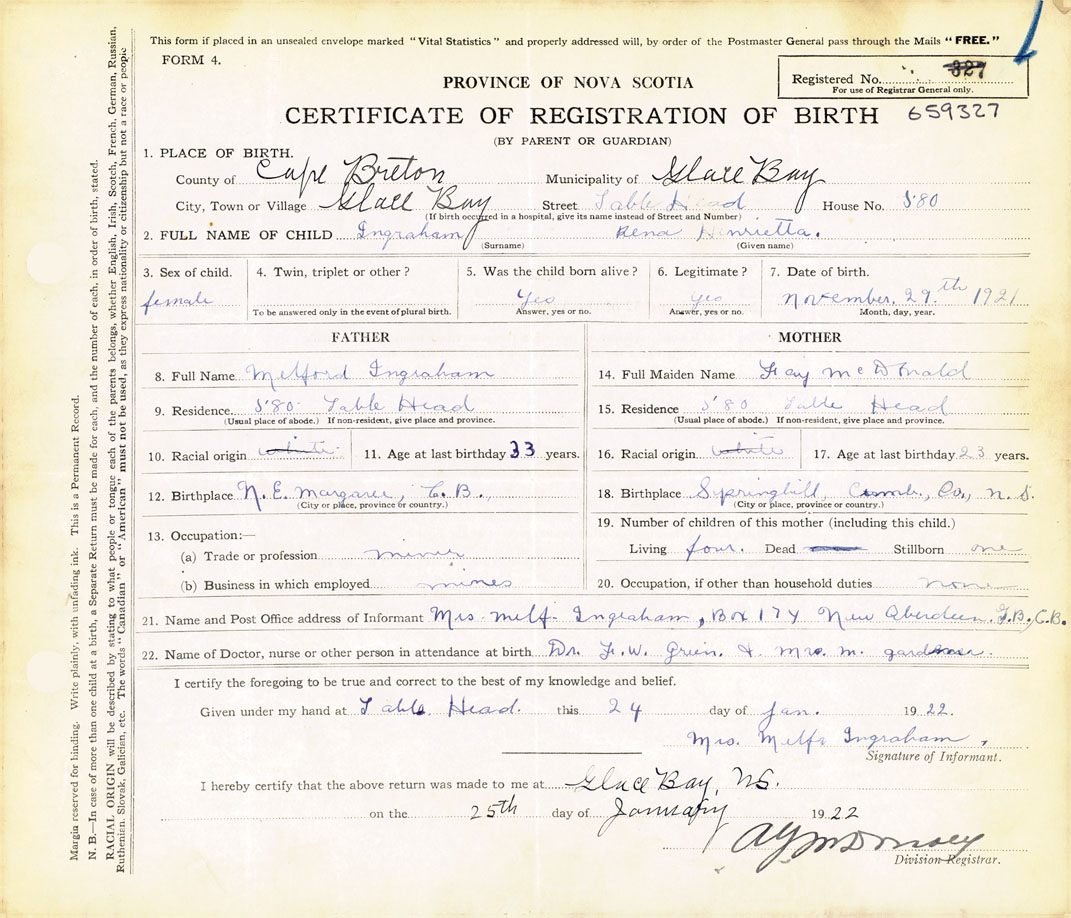 21. Name and Post Office address of Informant Mrs Melford Ingraham Box 174, New Aberdeen, GB, CB