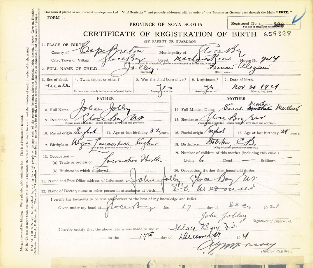 21. Name and Post Office address of Informant John Jolly Glace Bay