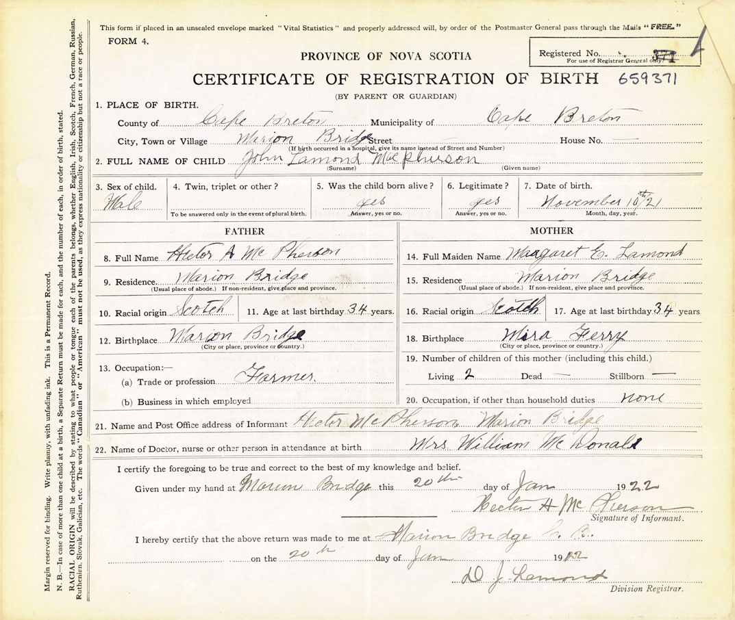 21. Name and Post Office address of Informant Hector McPherson Marion Bridge