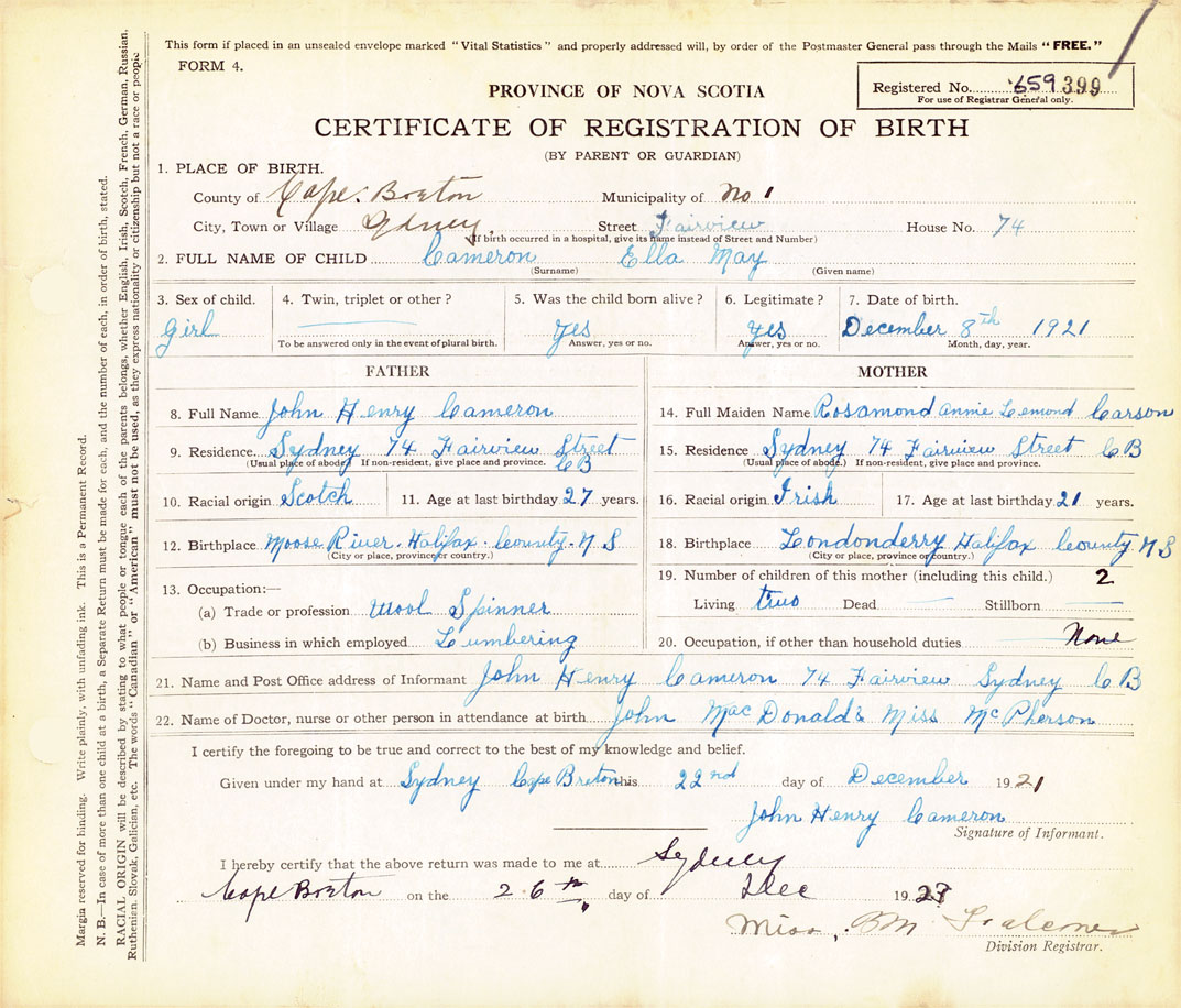 21. Name and Post Office address of Informant John Henry Cameron 74 Fairview, Sydney, CB