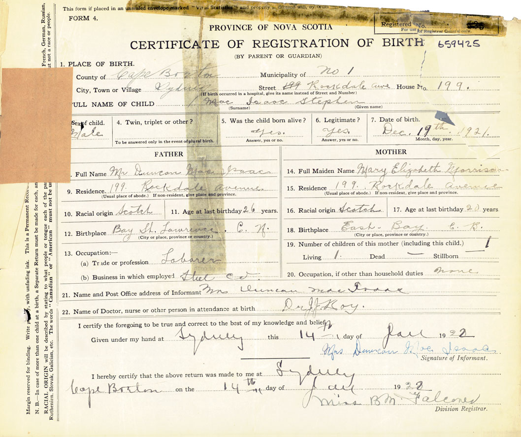 21. Name and Post Office address of Informant Mrs. Duncan MacIsaac