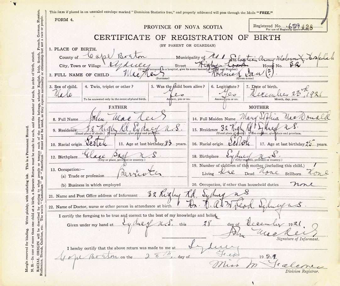 22. Name of Doctor, nurse or other person in attendance at birth Dr. D.A. MacLeod
