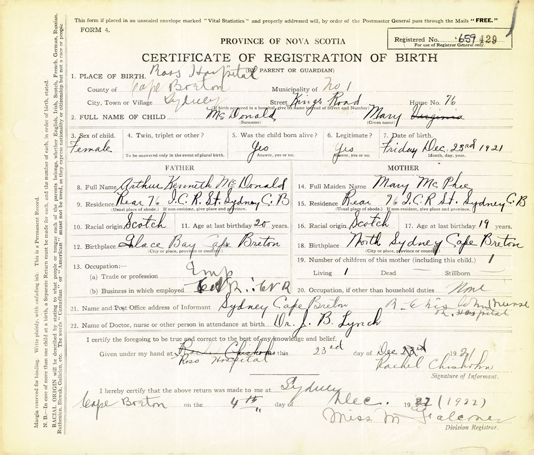 18. Birthplace North Sydney Cape Breton