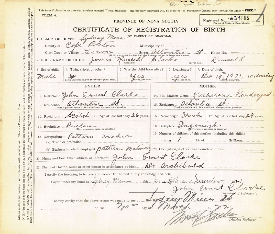 21. Name and Post Office address of Informant John Ernest Clarke Atlantic Street, Sydney Mines